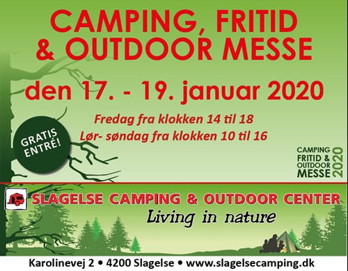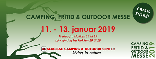 For 9. år i træk afholder vi igen Camping - Fritid og Outdoormesse i vores lokaler på Karolinevej 2 i Slagelse. Messen løber fra fredag d. 11. januar til og med d. 13. januar 2019. Åbningstiderne vil i år være: