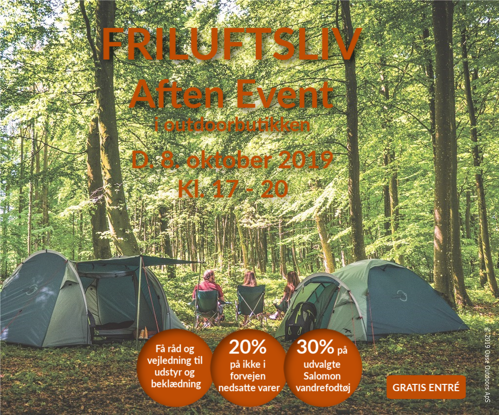 Denne aften giver vi 20% på alle ikke i forvejen nedsatte varer i outdoorbutikken samt 30% på udvalgt Salomon vandrefodtøj og 10% på campingudstyr i campingcenteret.