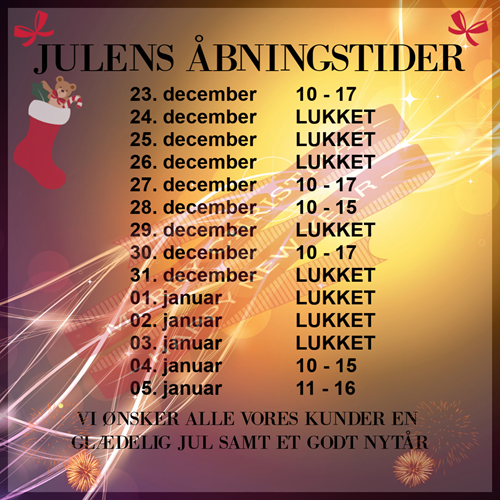 Her kan du se butikkens og værkstedets åbningstider henover Julen og Nytåret.